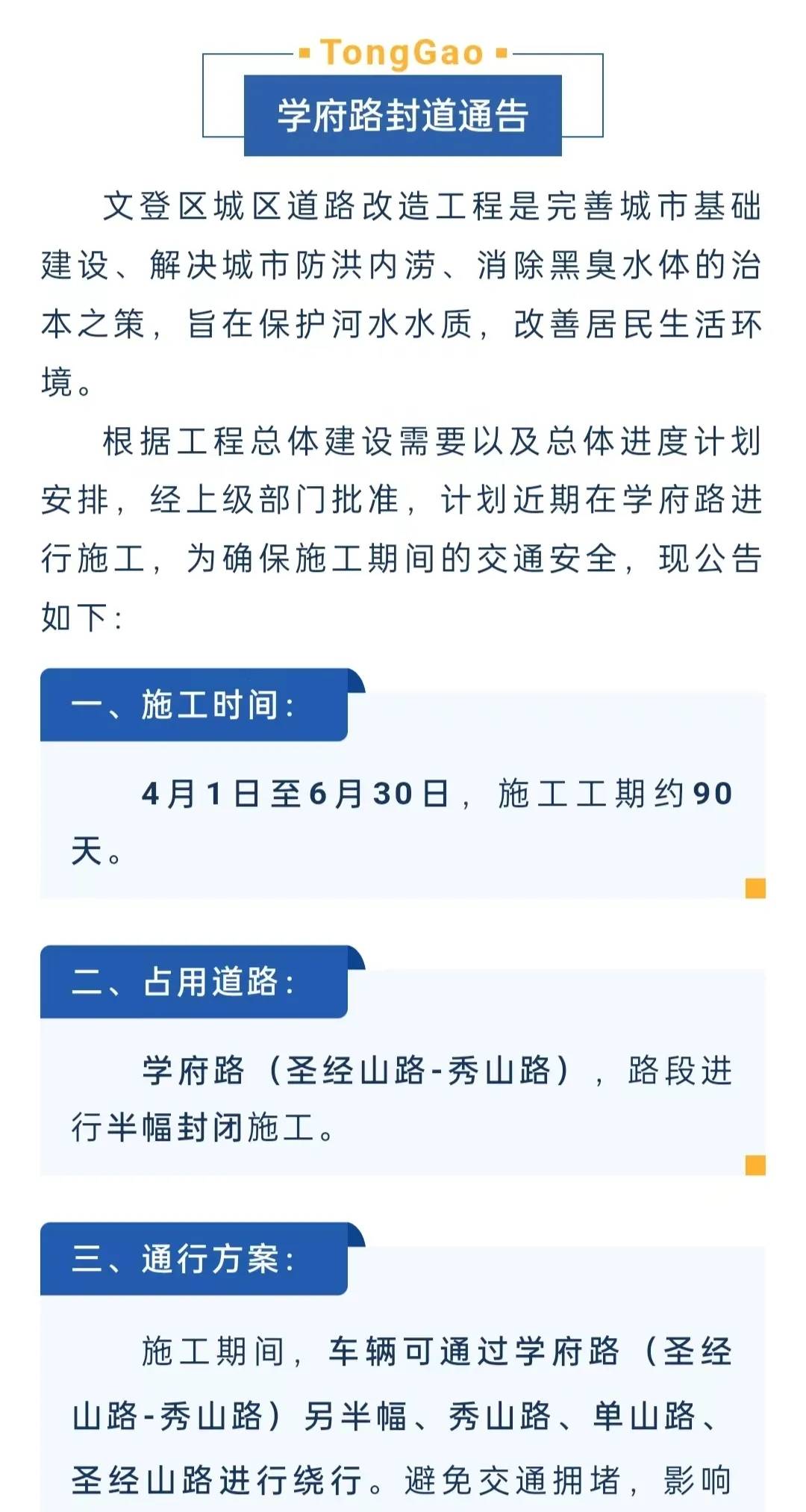 4月1日至6月30日,文登區(qū)學(xué)府路封道通告