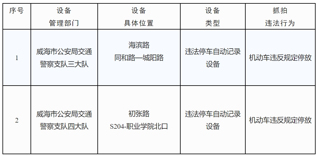 為保證道路交通安全,預防和減少交通事故的發(fā)生,根據(jù)《中華人民共和國道路交通安全法》及其實施條例等法律法規(guī)和相關技術規(guī)范的規(guī)定,依據(jù)《公安機關執(zhí)法公開規(guī)定》,現(xiàn)將威海市新增2處交通技術監(jiān)控設備予以公示,自6月3日起,將對有關交通違法行為進行依法管理,請廣大交通參與者自覺遵守道路交通安全法律法規(guī),共同維護良好的道路交通環(huán)境。