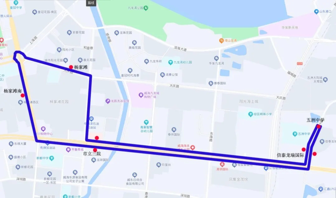 站點(diǎn)設(shè)置:楊家灘、鉑麗斯大酒店、市立三院、信泰龍瑞國(guó)際、五洲中學(xué)、信泰龍瑞國(guó)際、市立三院、楊家灘。